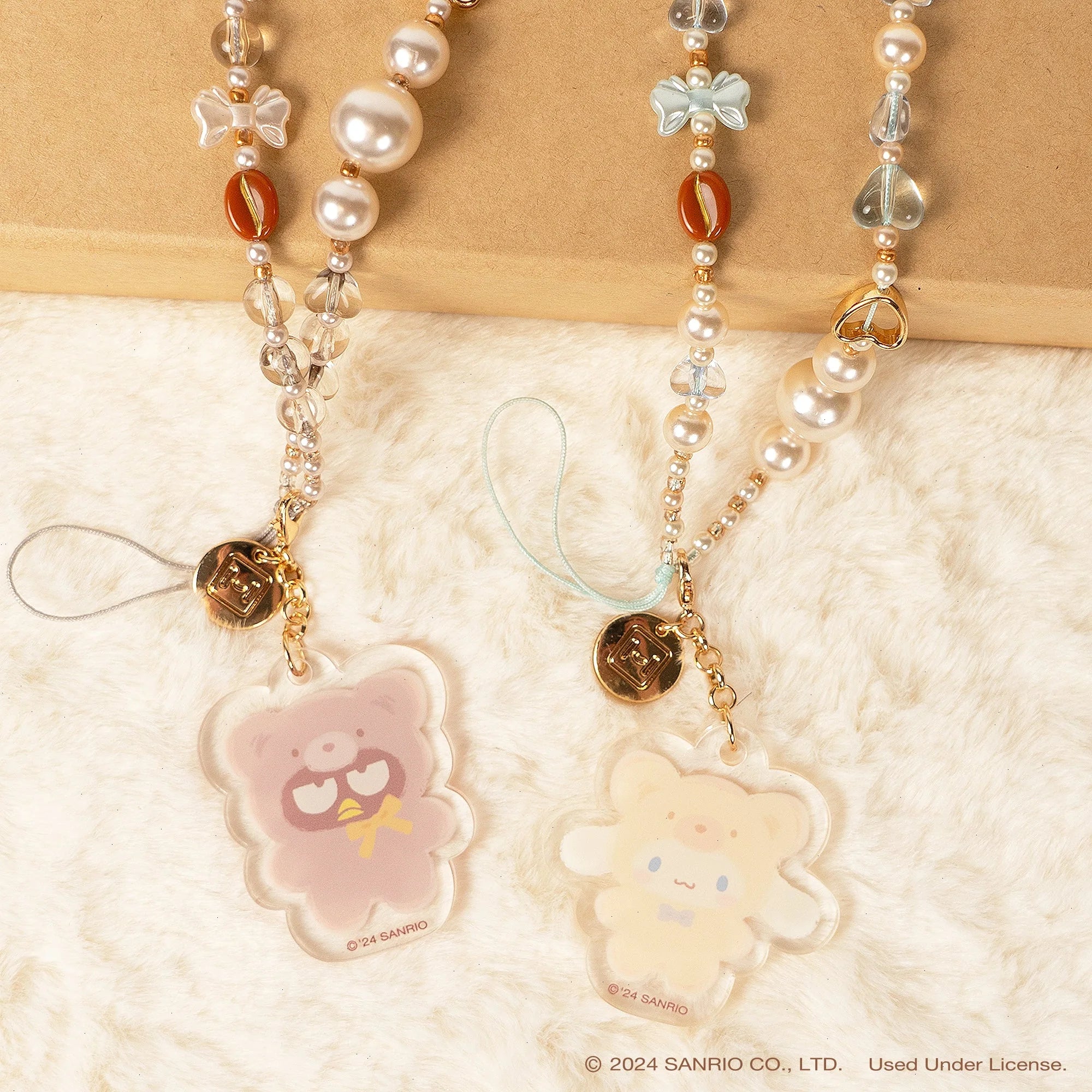 ♡ HELLO KITTY AND FRIENDS LATTE BEAR BEADED CHARM STRAPS - Supercute wristlets for phones, wallets, and more with clear and pearlescent acrylic beads, heart, coffee bean, and bow-shaped statement beads, plus detachable keychain charms featuring Hello Kitty, My Melody, Cinnamoroll, Pompompurin, Pochacco, and Badtz-maru!