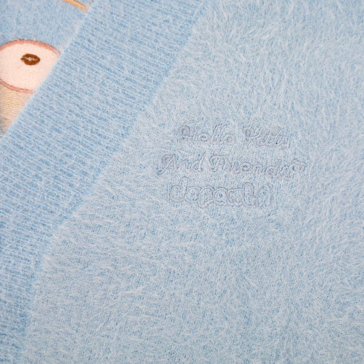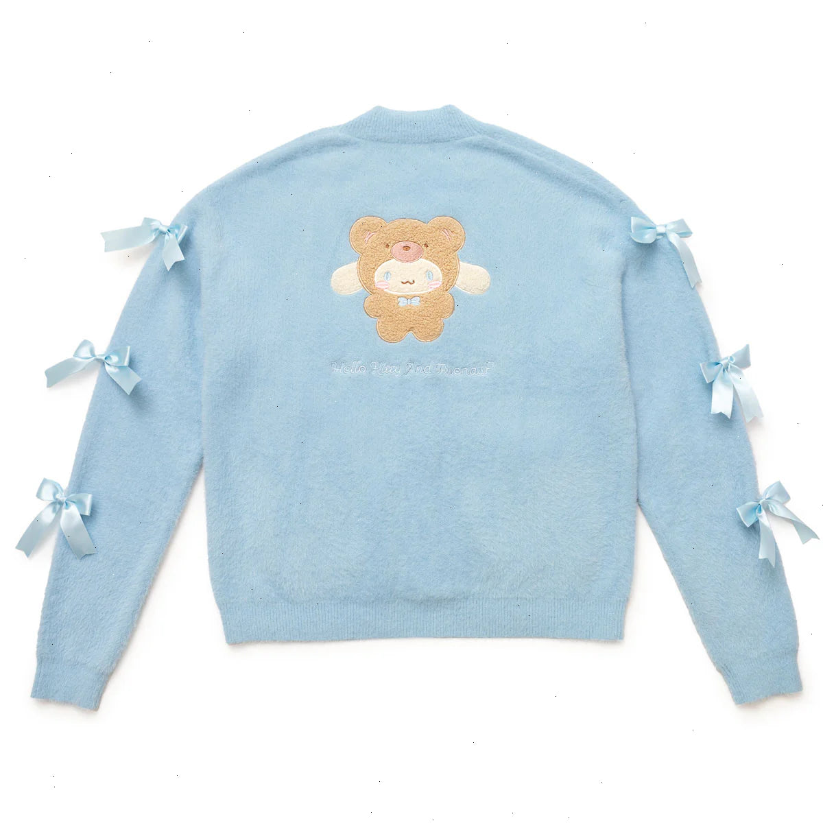 Stay stylishly snug with the Cinnamoroll Cozy Kuma JapanLA Cardigan. This soft and fuzzy cardigan features dainty text embroidery, embroidered applique of Cinnamoroll in a bear outfit in the front pocket and on the back, and satin bows along both sleeves. With your cozy companion by your side, this cardigan is perfect for lounging on lazy days or keeping warm on chilly outings!