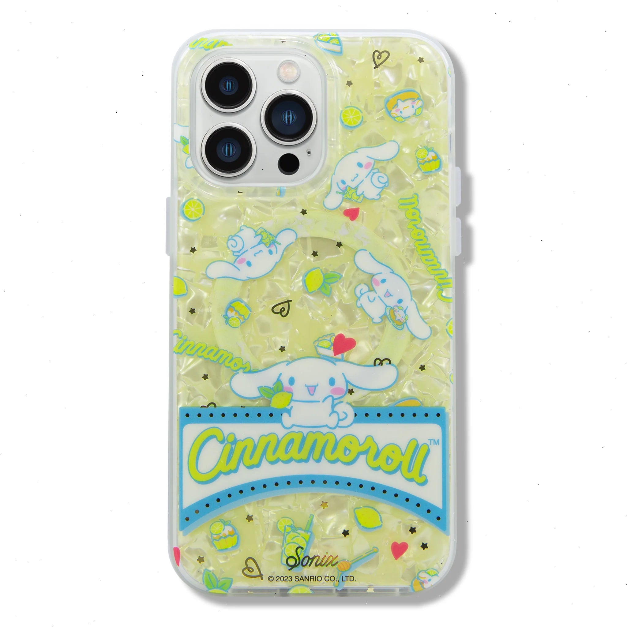 Our best-selling CInnamoroll™ collection is back! This yellow tortoise print MagSafe® compatible case features Cinnamoroll™ himself, lemons and loving hearts!