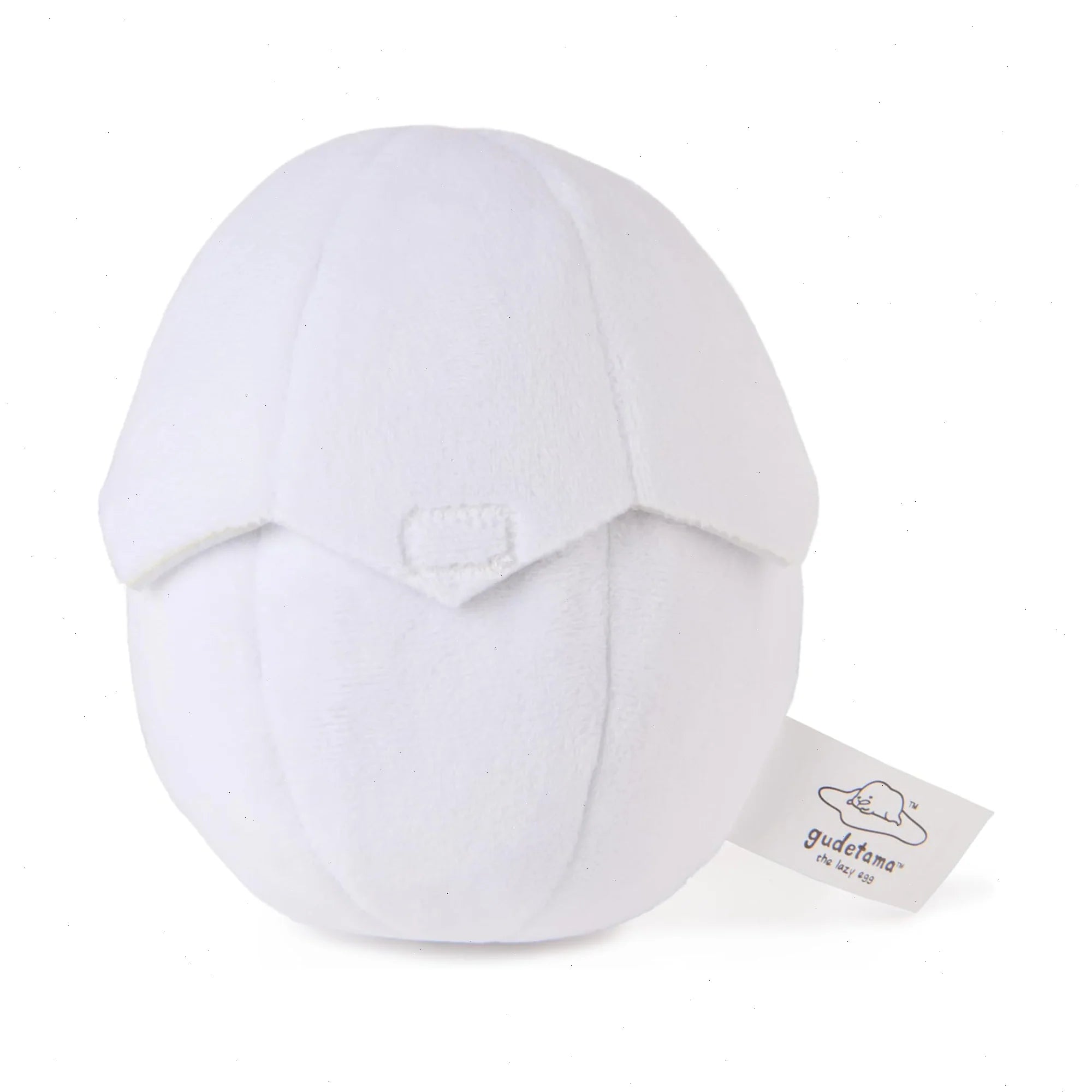 Gudetama just needs five more minutes in its shell. The lazy egg from the world of Sanrio arrives as a 5” yolk inside a cracked eggshell, with an alarmed expression and raised arms. The soft, structured eggshell has a white plush exterior and Velcro enclosure.