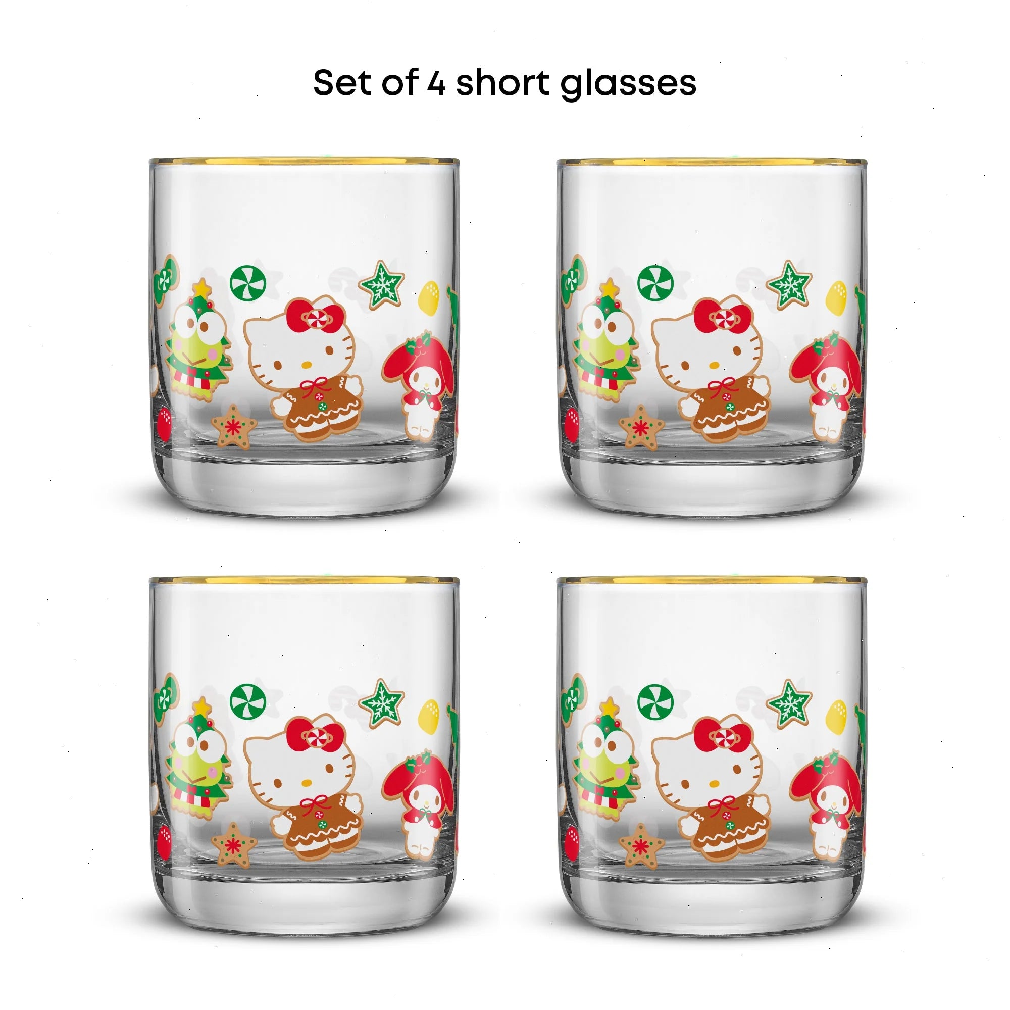 Fill holiday gatherings with laughter, joy, and the delightful company of your favorite Sanrio characters! Our set of 4 short glasses features festive wraparound designs of Badtz-maru, Chococat, Cinnamoroll, Hello Kitty, Keroppi, Kuromi, My Melody, and Pompompurin, all dressed up in their gingerbread finest. With their comfortable grip, sturdy base, and charming gold rims, these glasses are designed for easy sipping and spill-free enjoyment. Add a touch of kawaii to your holiday celebrations!