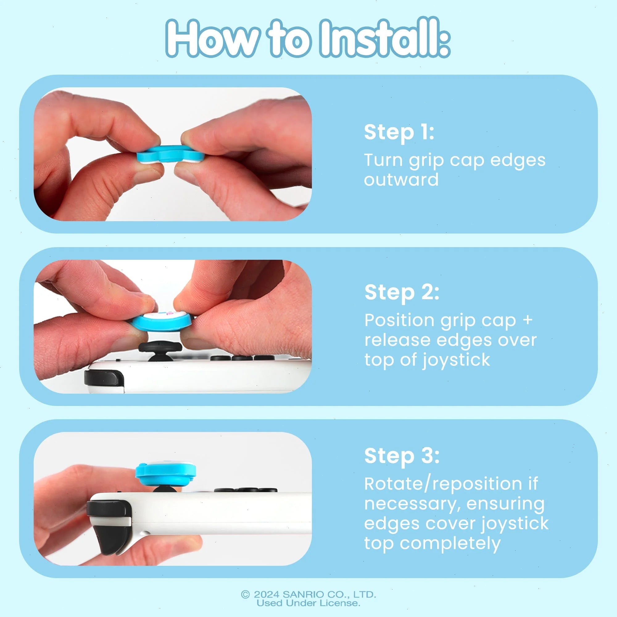 ♡ AVAILABLE STYLES ♡ Available in three sets: Hello Kitty and Keroppi, Cinnamoroll, and Pompompurin, and My Melody and Kuromi. Each set contains two character grip caps and two coordinating figure grip caps including Kuromi’s skull emblem, a strawberry (My Melody’s favorite!), Hello Kitty’s iconic apple, and more! You can mix and match them however you like!
