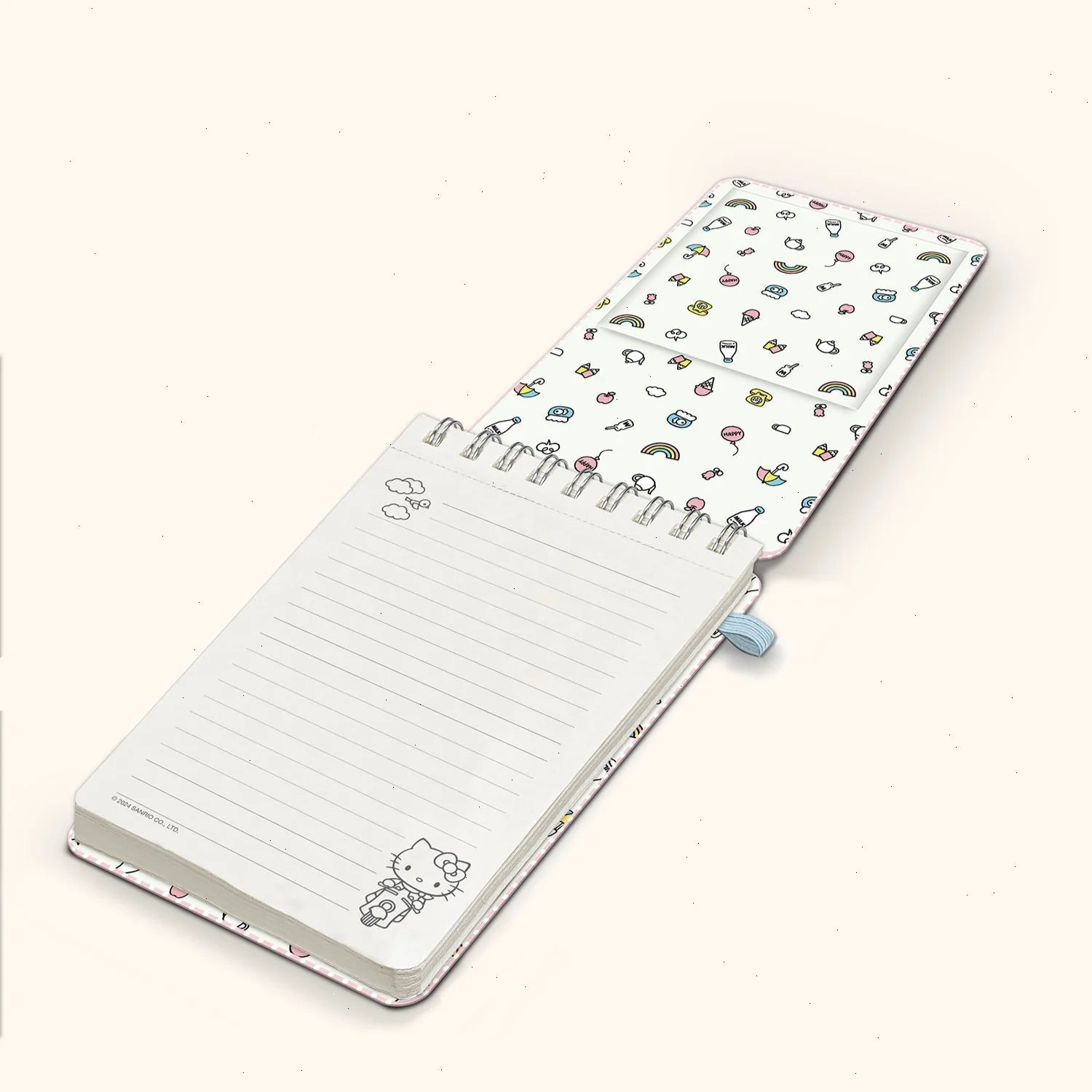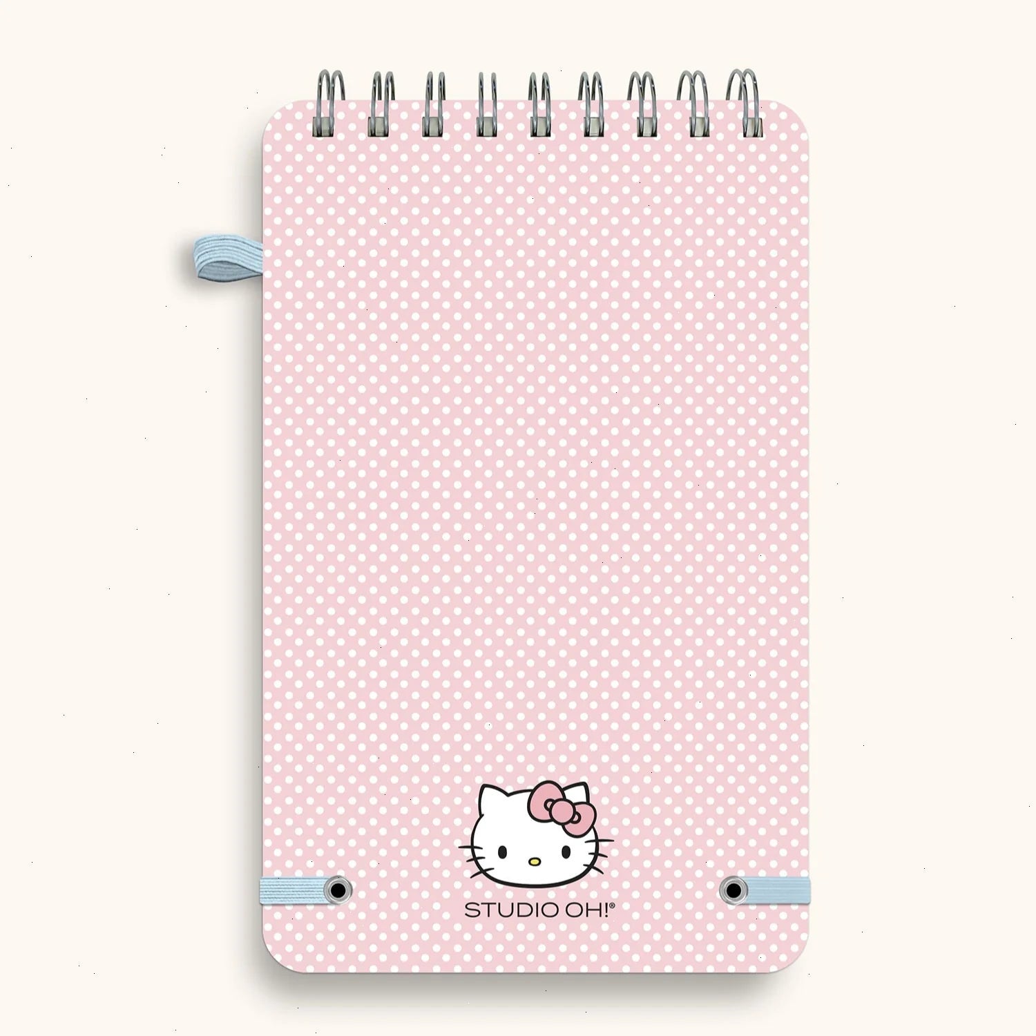 Enhance your writing routine with our Hello Kitty–themed top-spiral notebook. This classic and stylish notebook features a durable cover and 192 lined pages, providing ample space for your thoughts, ideas, and plans to flourish. Designed for convenience, these notebooks come equipped with a pen loop and an interior pocket for storing notes and other documents. Ensure your essentials are well-protected with the secure elastic-band closure, and enjoy seamless flipping with the top-spiral design. Happy writing!