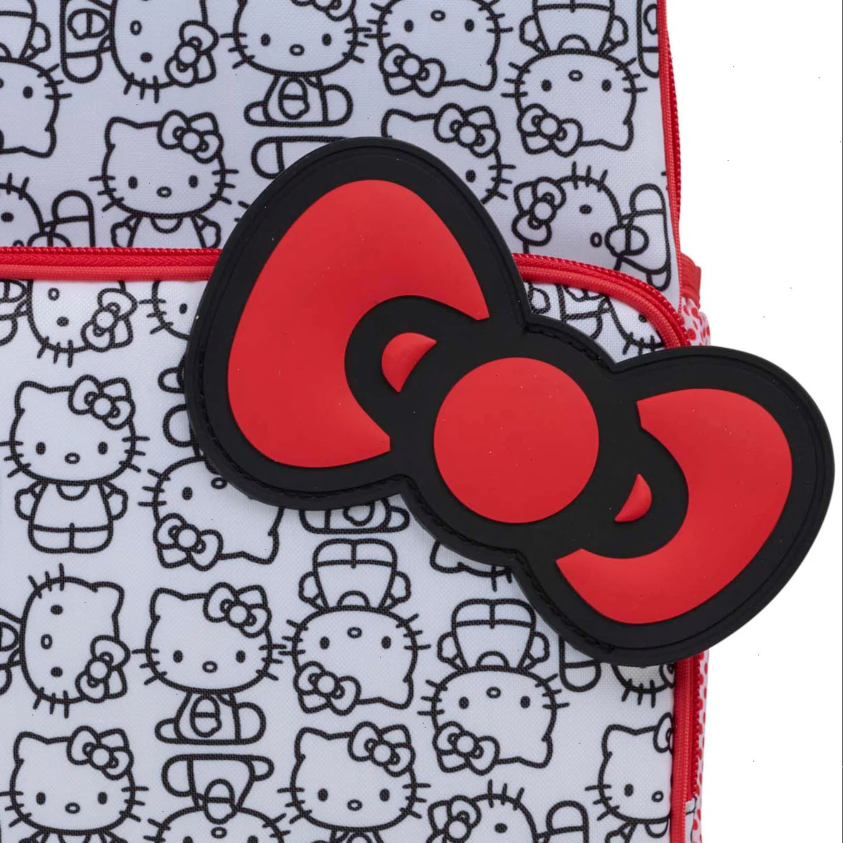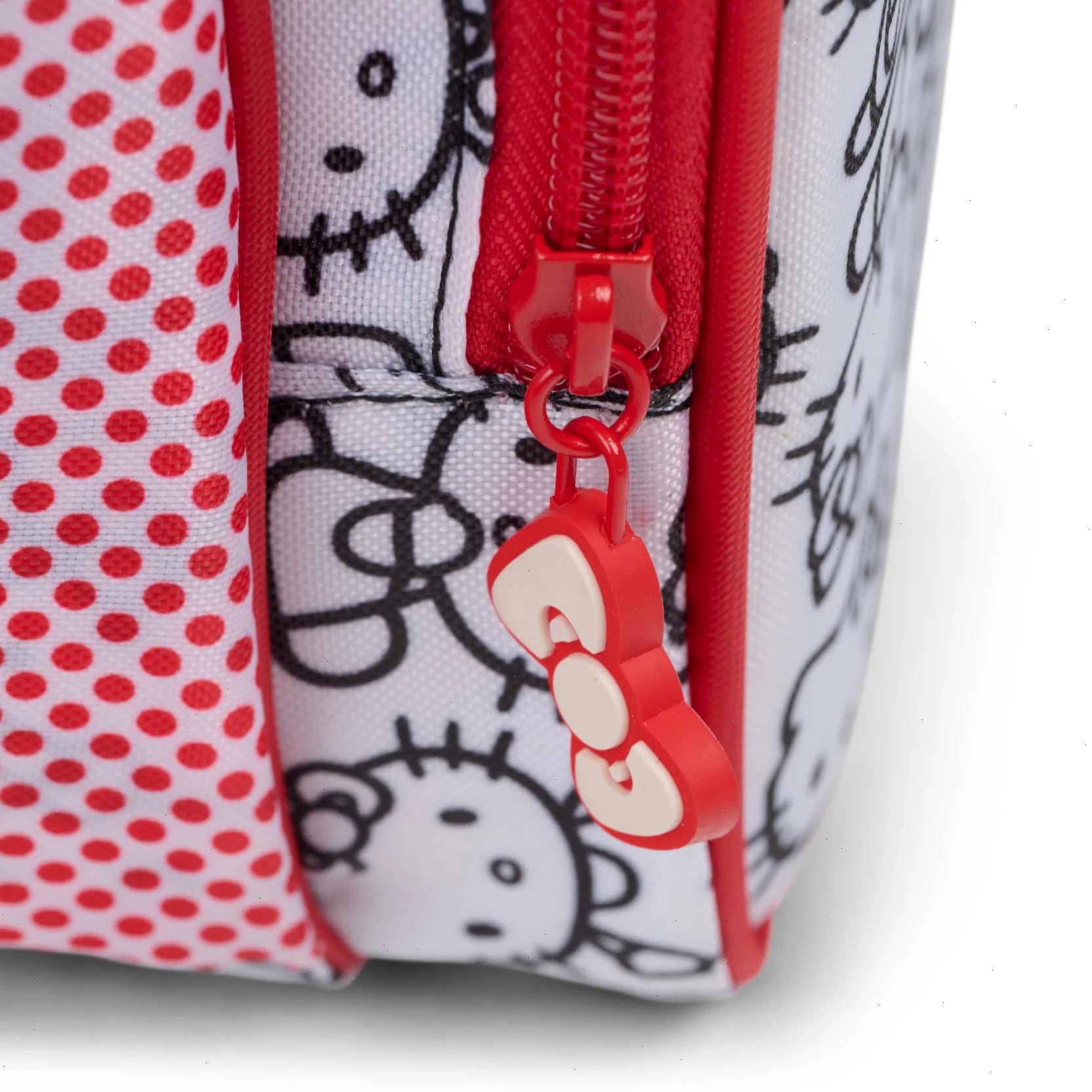 ♡ Designed with a black and white Hello Kitty face screenprint on the cooler body and a red and white dot screenprint on side pockets