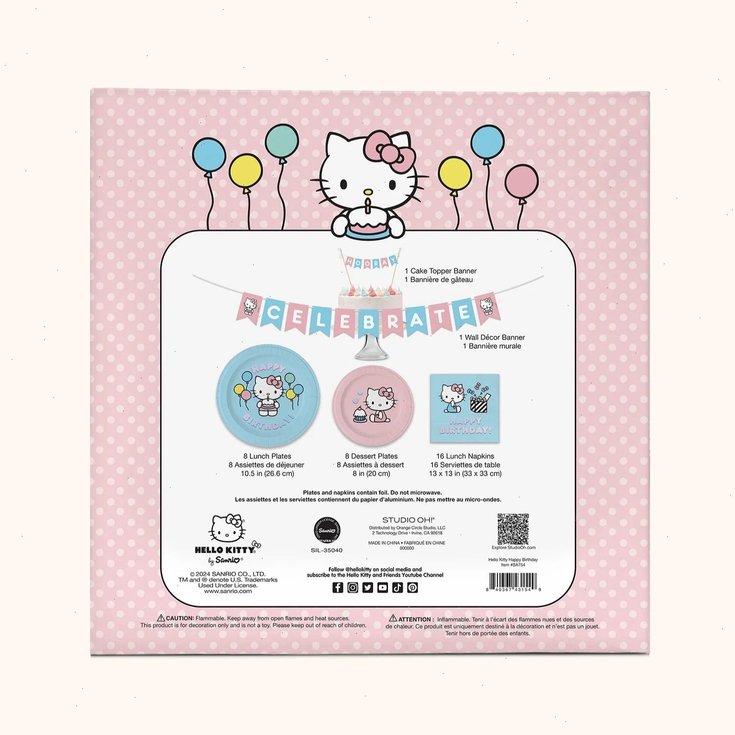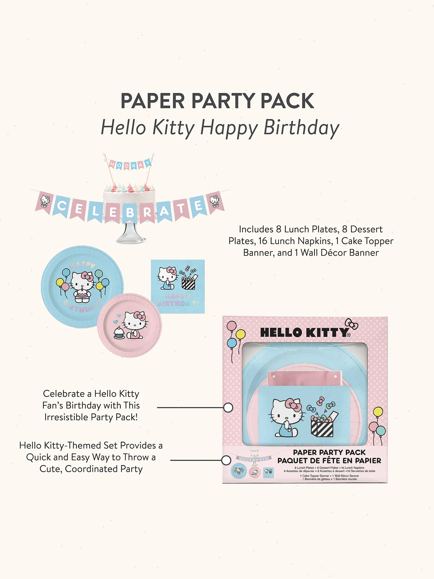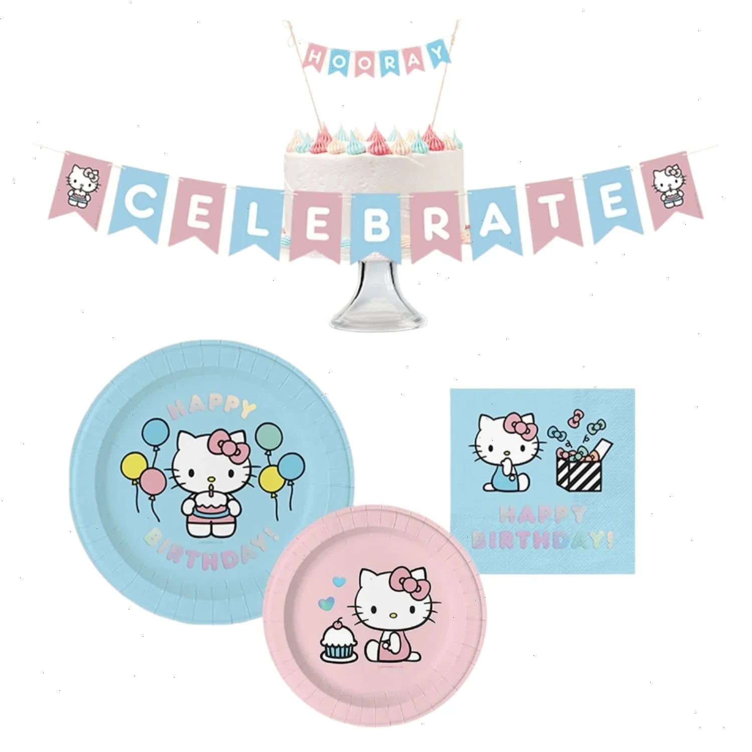 Get ready for a fun-filled celebration with our all-in-one Hello Kitty–themed party set! Packed with 8 lunch plates, 8 dessert plates, 16 lunch napkins, a cake topper banner, and a wall décor banner, this comprehensive, coordinating set will infuse any birthday celebration with both charm and ease. Birthdays become extra-special when Hello Kitty is an honored guest!